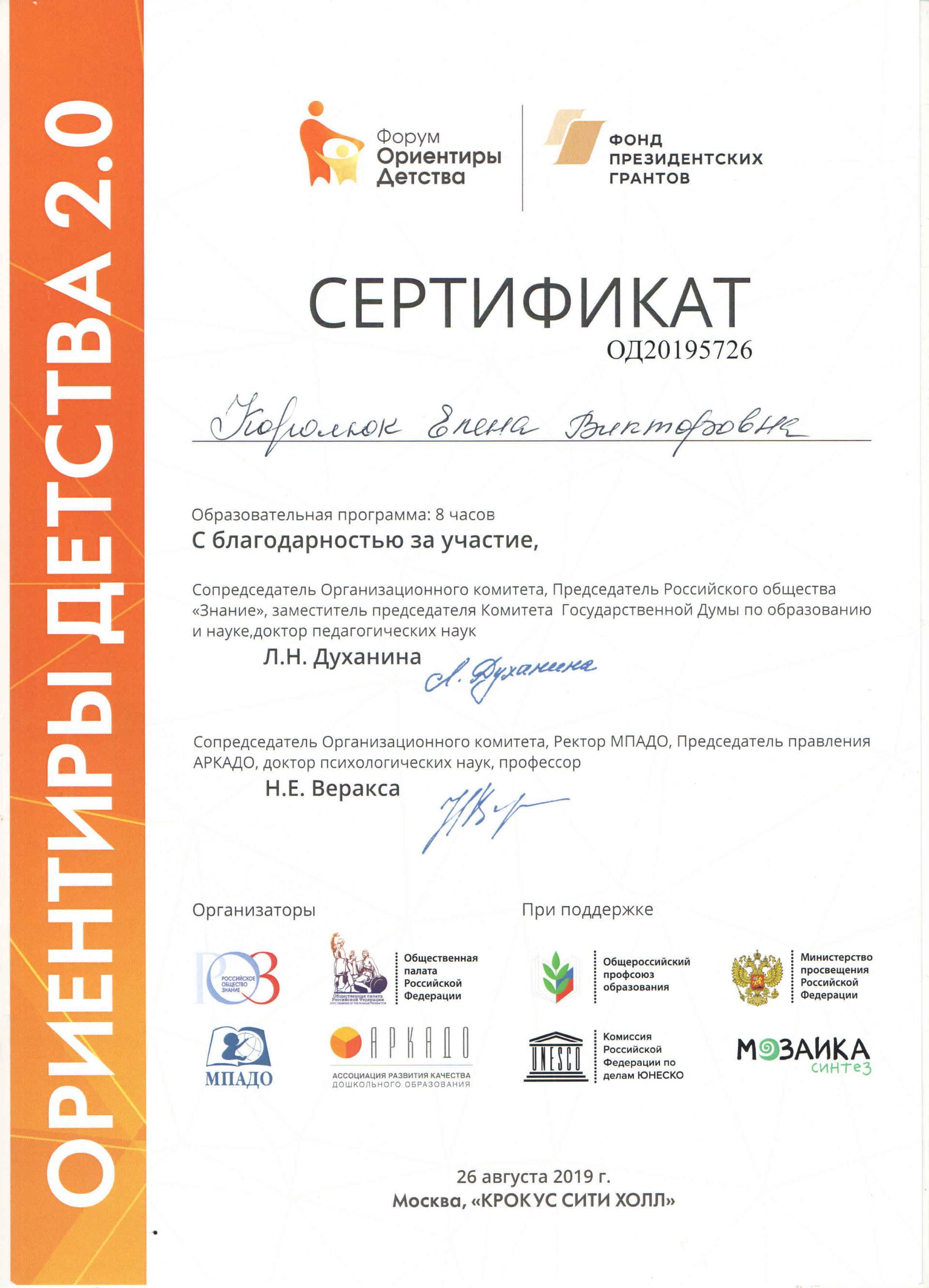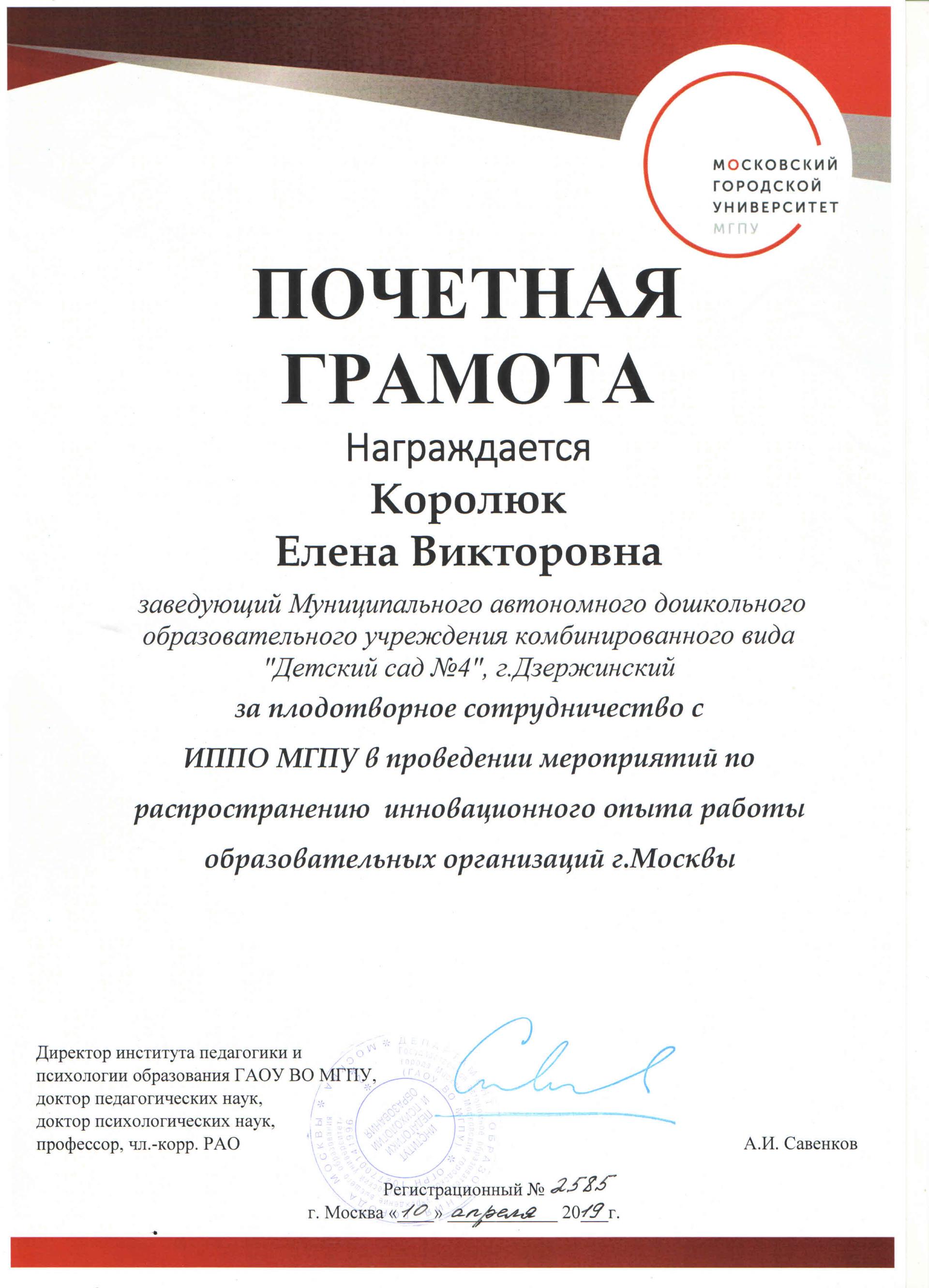 2019 г. Награждена благодарственным письмом Президента Российской Федерации В.В.Путина «За активное участие в работе ОНФ»
